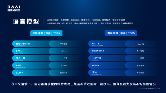 据评测结果,在中文语境下,字节跳动豆包Skylark2、OpenAI GPT-4位居第一、第二,国产大模型更懂中国用户。在语言模型客观评测中,OpenAI GPT-4、百川智能Baichuan3位列第一、第二。百度文心一言4.0、智谱华章GLM-4和月之暗面Kimi均进入语言模型主客观评测前五。