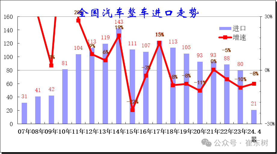 5 月 26 日消息,乘联会秘书长崔东树今日发文指出,中国进口车进口量从 2017 年的 124 万台持续以年均 8% 左右下行,到 2023 年仅有 80 万台。2024 年 1-4 月汽车进口 21 万台,同比下降 8%,下滑趋势延续。